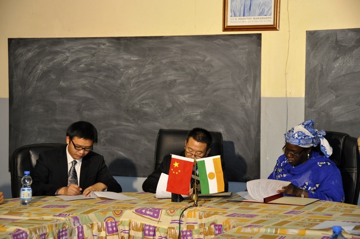 中国驻尼日尔大使夏煌(中)和尼教育部部长Ali Mariama Elhadj Ibrahim(右) 共同签署施工合同